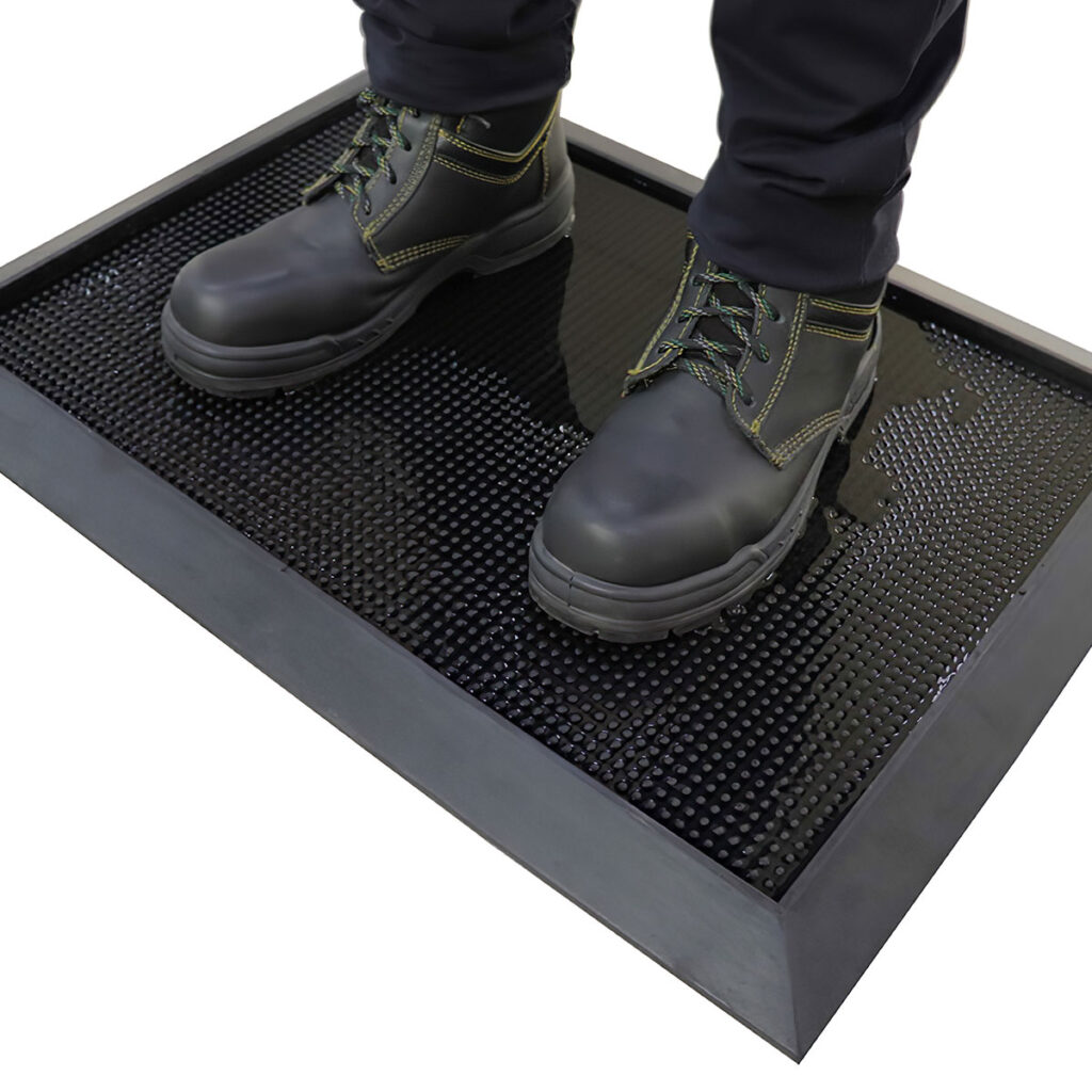 Alfombrillas tratadas con soluciones desinfectantes que eliminan contaminantes de calzado, contribuyendo a mantener áreas limpias y seguras.